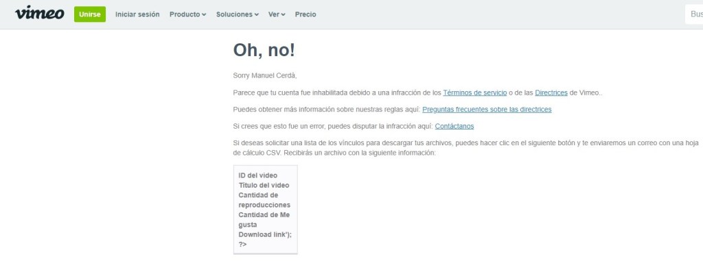 ¿Por qué habrán cerrado mi cuenta? ¿Cuál es el vídeo ‘responsable’? Ni pajolera idea, pues esta es cuanta información tengo: